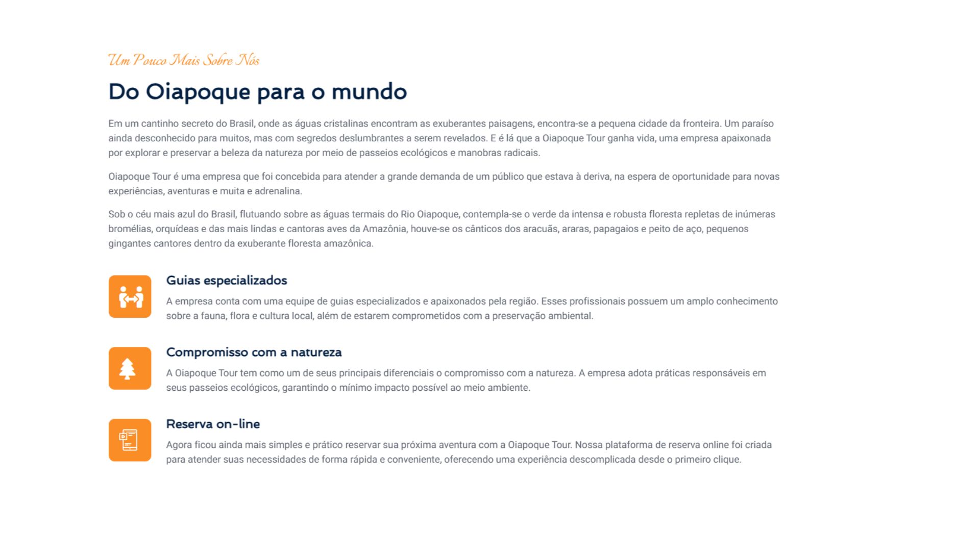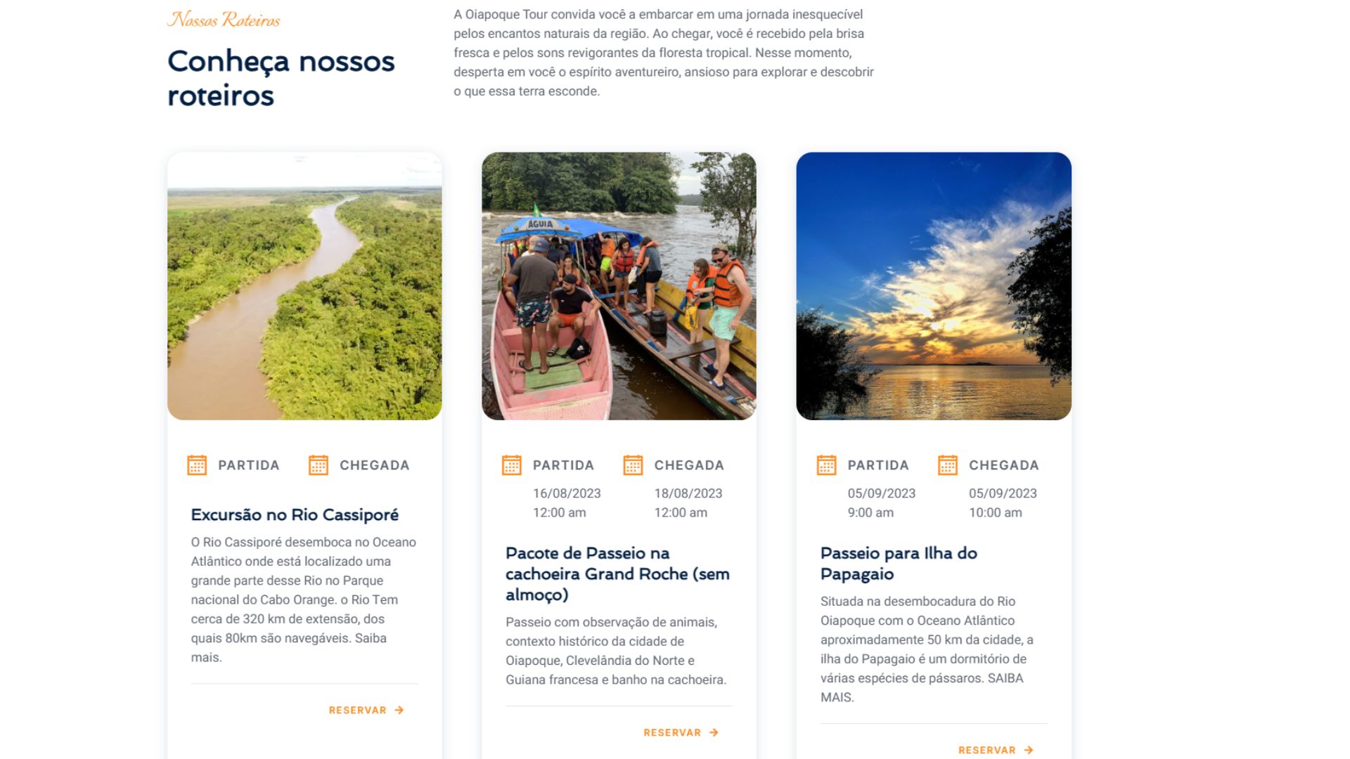 A Oiapoque Tour, localizada em um paraíso ainda desconhecido, queria expandir sua presença online e oferecer a todos a chance de descobrir a beleza escondida da região. Eles precisavam de um website que não só compartilhasse a magia da Amazônia, mas também tornasse a reserva de passeios rápida e descomplicada.